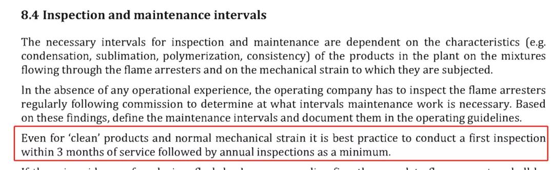 一個(gè)是國際標(biāo)準(zhǔn)化組織的《ISO 16852-2016 Flame Arresters-Performance Requirements, Test Methods And Limits For Use》,另一個(gè)是歐盟標(biāo)準(zhǔn)化委員會(huì)的《CEN-TR 16793-2016 Guide for the selection, application and use of flame arresters》,其中在CEN-TR 16793系列中,對在用阻火器的定期檢測有如下描述: