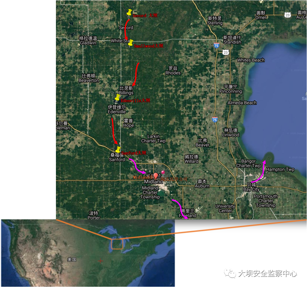 由于持續(xù)降雨,密歇根州Tittabawassee河上發(fā)生梯級(jí)水電站連續(xù)潰壩(漫壩)。美國當(dāng)?shù)貢r(shí)間5月19日19:30左右,Edenville大壩漫壩并潰決,下泄洪水于20:49又沖垮下游Sanford大壩,迫使密歇根州中部約1萬人撤離。另據(jù)外媒報(bào)道,Edenville大壩上游的Smallwood大壩也發(fā)生漫壩,具體時(shí)間不詳。根據(jù)美國有線新聞網(wǎng)CNN當(dāng)?shù)貢r(shí)間5月20日17時(shí)左右報(bào)道,潰壩洪峰已經(jīng)過去,目前暫無人員傷亡報(bào)道。前日,我們于事故發(fā)生的第一時(shí)間報(bào)道相關(guān)情況(突發(fā)!美國密歇根州連潰兩壩 上萬人緊急撤離),隨著當(dāng)?shù)孛襟w報(bào)道與披露資料的不斷增多,我們嘗試著進(jìn)一步廓清這次重大事故的種種疑團(tuán),并探討它為我國大壩安全監(jiān)督管理帶來的警示。密歇根州Tittabawassee河修建有4座水電站大壩,從上游依次為Secord、Smallwood、Edenville和Sanford,工程主要任務(wù)均是發(fā)電。上述四座水電站均修建于1924年,至今已服役96年,現(xiàn)由Boyce Hydro公司負(fù)責(zé)運(yùn)營。