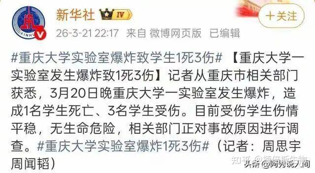 3月20日晚7點,重慶大學(xué)科學(xué)城校區(qū)的一個實驗室突然爆炸。當時有四名學(xué)生在里面做實驗,爆炸發(fā)生后一名學(xué)生當場死亡三人受傷,現(xiàn)場儀器碎了一地,地上還有血跡。
