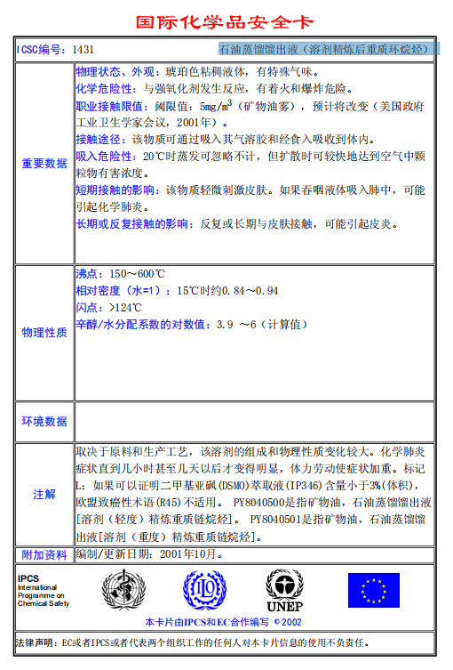 石油蒸餾餾出液(溶劑精煉后重質(zhì)環(huán)烷烴)MSDS
