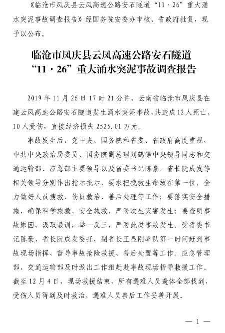 2019年11月26日17時21分許,云南省臨滄市鳳慶縣在建云鳳高速公路安石隧道發(fā)生涌水突泥事故,共造成12人死亡、10人受傷,直接經(jīng)濟損失2525.01萬元。