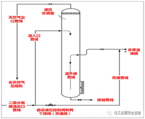 2.1 Sonat公司 圖2:原油分離流程簡(jiǎn)圖 每一套油氣分離裝置都包括3臺(tái)串聯(lián)的分離器,設(shè)置多臺(tái)分離器的目的是最大化天然氣回收量。一級(jí)分離器和二級(jí)分離器的最大允許操作壓力分別是9.9MPa和3.4MPa,當(dāng)壓力超過(guò)其最大允許操作壓力時(shí)會(huì)啟動(dòng)位于分離器頂部的泄壓閥。一級(jí)分離器和二級(jí)分離器的實(shí)際操作壓力稍低,分別為6.2MPa和1.6MPa。三級(jí)分離器(雖然Sonat公司將這個(gè)失效的容器稱作“蒸汽回收塔”或“儲(chǔ)罐”,但是CSB調(diào)查組認(rèn)為該容器實(shí)際上符合油氣分離器的定義,稱其為三級(jí)分離器的原因是它位于一級(jí)分離器和二級(jí)分離器的下游)的最大允許操作壓力為常壓,也是正常運(yùn)行時(shí)的壓力。由于物料通過(guò)一系列分離器時(shí)壓力下降,物料中天然氣的溶解度隨之降低,分離回收的天然氣比例增大。 前兩級(jí)分離器設(shè)計(jì)是用于三相(油/氣/水)分離,而三級(jí)分離器設(shè)計(jì)是用于兩相(油/氣)分離。油井物料在前兩級(jí)分離器內(nèi)的停留時(shí)間足以實(shí)現(xiàn)油相和水相的重力分離,分離器出來(lái)的天然氣直接進(jìn)入天然氣管線,生產(chǎn)水直接注入地層或者暫存在儲(chǔ)罐中。油相從一個(gè)分離器進(jìn)入下一個(gè)分離器,最終進(jìn)入儲(chǔ)罐,通過(guò)槽車運(yùn)至煉油廠。天然氣經(jīng)壓縮后通過(guò)管線送到天然氣處理裝置。 測(cè)試裝置和量產(chǎn)裝置的三級(jí)分離器都是13.7m高,直徑為1.2m,如圖3所示。運(yùn)行過(guò)程中,容器內(nèi)存料約為80%,油井物料從約10.7m高位置進(jìn)入分離器,分離的油相從約1.0m高位置出來(lái)。殘余的天然氣從油相中出來(lái)并在分離器頂部聚集,通過(guò)壓縮機(jī),然后與二級(jí)分離器出來(lái)的天然氣匯合。 圖3:三級(jí)分離器示意圖 3.1 事故發(fā)生前 1998年3月4日,Sonat公司計(jì)劃利用新建的量產(chǎn)分離裝置開(kāi)始Temple24-1井的生產(chǎn)。在正式生產(chǎn)前,量產(chǎn)裝置的設(shè)備以及連接油井和設(shè)備的3200m長(zhǎng)的管線需要進(jìn)行吹掃,排出設(shè)備及管線內(nèi)的空氣。吹掃是油氣生產(chǎn)工藝中的常規(guī)操作,目的是降低可燃油氣造成的爆炸風(fēng)險(xiǎn)。在這次事故中,吹掃操作是通過(guò)使用其中的1口油井采出的高壓井流置換設(shè)備內(nèi)的空氣,被置換的空氣從一個(gè)敞開(kāi)的儲(chǔ)罐孔口處釋放出來(lái)。當(dāng)系統(tǒng)內(nèi)的空氣濃度足夠低時(shí),設(shè)備將封閉,準(zhǔn)備開(kāi)始生產(chǎn)。 Sonat公司監(jiān)督?jīng)Q定通過(guò)2個(gè)階段執(zhí)行吹掃過(guò)程:(1)使用附近的Temple22-1井產(chǎn)流體吹掃量產(chǎn)裝置設(shè)備;(2)使用Temple24-1井產(chǎn)流體吹掃連接Temple24-1井和裝置的3200m長(zhǎng)管線。每次吹掃都需要操作一系列的閥門。第一次吹掃操作(量產(chǎn)設(shè)備的吹掃)在事故當(dāng)天的下午順利完成。 3.2 事故發(fā)生 量產(chǎn)裝置設(shè)備吹掃操作完成后,開(kāi)始準(zhǔn)備吹掃連接24-1井的3200m長(zhǎng)管線。如圖4所示,他們的吹掃方案如下: 由24-1井至量產(chǎn)裝置(打開(kāi):閥1;關(guān)閉:閥23、閥24、閥26); 由量產(chǎn)裝置至儲(chǔ)罐,旁通分離器和原油冷卻器(打開(kāi):閥8、閥9、閥10、閥11、閥12、閥13,閥16;關(guān)閉:閥2、閥3、閥4、閥5、閥6、閥7、閥14、閥15); 經(jīng)過(guò)儲(chǔ)罐,從敞開(kāi)的頂部孔口出去(打開(kāi):閥17、孔口21;關(guān)閉:閥18、閥19、孔口20) 圖4:最終的閥門設(shè)置方案 執(zhí)行這個(gè)吹掃方案,至少需要手動(dòng)重置11個(gè)閥門,這個(gè)過(guò)程沒(méi)有書面操作程序和閥位檢查表。大部分閥門是手動(dòng)操作的球閥,閥12是一個(gè)通過(guò)位于三級(jí)分離器內(nèi)部的液位計(jì)啟動(dòng)的氣動(dòng)閥門。該設(shè)備出現(xiàn)高液位時(shí),會(huì)自動(dòng)打開(kāi)閥12,允許流體旁通分離器(在鄰近的手動(dòng)球閥11和球閥13打開(kāi)的情況下)。3月4日上午,操作人員斷開(kāi)了連接閥12的儀表氣,導(dǎo)致之后閥12一直處于打開(kāi)狀態(tài)。 當(dāng)施工監(jiān)督和操作人員重置了上述閥門,管線吹掃操作開(kāi)始進(jìn)行。Sonat公司生產(chǎn)監(jiān)督和一名操作人員位于24-1井的附近,與施工監(jiān)督通過(guò)無(wú)線電保持溝通。下午5:10,生產(chǎn)監(jiān)督指揮操作人員打開(kāi)閥22(位于油井下游的節(jié)流閥),引導(dǎo)流體進(jìn)入3200長(zhǎng)的管線。根據(jù)預(yù)測(cè),初始井流將主要是天然氣,后期將是天然氣、油和水的多相混合物。Sonat施工監(jiān)督位于閥23附近,他打開(kāi)了這個(gè)小閥門,使用移動(dòng)式氧氣檢測(cè)儀測(cè)試排出氣體中的氧氣濃度,氧氣濃度的下降表示出吹掃操作的進(jìn)度。 隨著吹掃操作的進(jìn)行,根據(jù)監(jiān)測(cè),閥23處的氧氣濃度開(kāi)始下降,施工監(jiān)督關(guān)閉了閥23。他每隔幾分鐘打開(kāi)閥23,繼續(xù)定期檢測(cè)氧氣濃度。下午6:00左右,根據(jù)壓力表27的顯示,閥22下游壓力約5.5MPa。下午6:10,施工監(jiān)督最終檢測(cè)到的氧氣濃度低于3%,表示吹掃過(guò)程已接近完成。隨后他乘坐汽車去檢查一個(gè)距離約90m遠(yuǎn)的管線閥門的閥位,此時(shí),之前在24-1