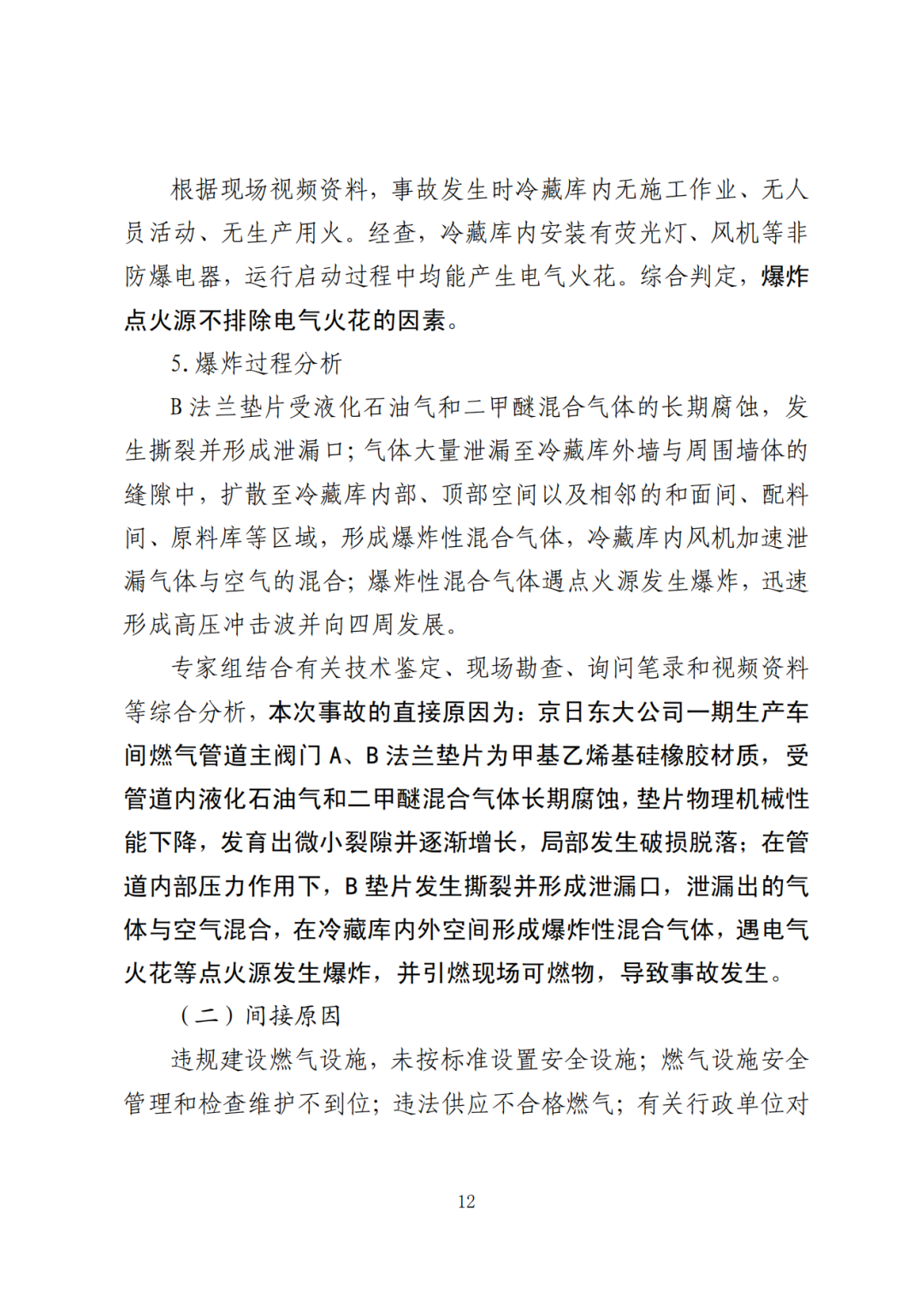 本次事故的直接原因?yàn)椋?/strong>京日東大公司一期生產(chǎn)車間燃?xì)夤艿乐鏖y門A、B法蘭墊片為甲基乙烯基硅橡膠材質(zhì),受管道內(nèi)液化石油氣和二甲醚混合氣體長(zhǎng)期腐蝕,墊片物理機(jī)械性能下降,發(fā)育出微小裂隙并逐漸增長(zhǎng),局部發(fā)生破損脫落;在管道內(nèi)部壓力作用下,B墊片發(fā)生撕裂并形成泄漏口,泄漏出的氣體與空氣混合,在冷藏庫內(nèi)外空間形成爆炸性混合氣體,遇電氣火花等點(diǎn)火源發(fā)生爆炸,并引燃現(xiàn)場(chǎng)可燃物,導(dǎo)致事故發(fā)生。