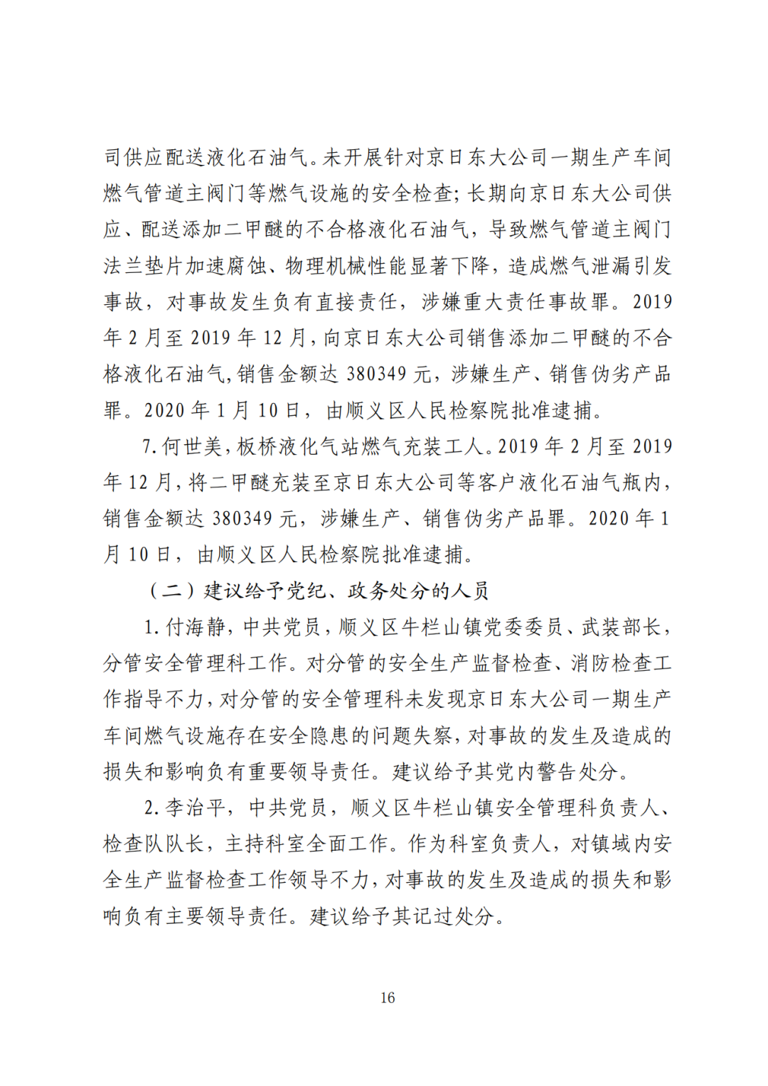 根據(jù)國家有關法律法規(guī)規(guī)定,事故調查組認定,京日東大公司“12·3”燃氣爆炸事故是一起較大生產(chǎn)安全責任事故。 本次事故爆炸中心位于冷藏庫區(qū)域,爆炸氣體為液化石油氣。 違規(guī)建設燃氣設施,未按標準設置安全設施;燃氣設施安全管理和檢查維護不到位;違法供應不合格燃氣;有關行政單位對違法違規(guī)問題查處不力。 1.曾九發(fā),京日東大公司生產(chǎn)部部長,全面負責生產(chǎn)部管理工作,負責本部門的消防安全、生產(chǎn)安全、設備安全工作。未有效開展燃氣設施檢修維護工作,致使一期生產(chǎn)車間燃氣管道長期未得到維護保養(yǎng);未嚴格組織開展燃氣設施的檢查、檢測工作;未及時有效排查燃氣設施存在的事故隱患;未有效開展本部門員工的燃氣安全知識和操作技能培訓工作,對事故發(fā)生負有直接責任,涉嫌重大責任事故罪。2019年12月17日,由順義區(qū)人民檢察院批準逮捕。 2.馬維,京日東大公司生活部副部長(履行部長職責)、廠級安全管理員,全面負責全廠消防安全和安全保衛(wèi)工作。未組織開展一期生產(chǎn)車間燃氣管道檢查,未有效落實燃氣設施檢查管理制度;未及時排查發(fā)現(xiàn)燃氣設施存在的事故隱患;未組織開展燃氣安全知識和操作技能培訓,未組織擬訂本單位的燃氣應急預案及措施,對事故發(fā)生負有直接責任,涉嫌重大責任事故罪。2019年12月17日,由順義區(qū)人民檢察院批準逮捕。 3.郭新剛,京日東大公司生產(chǎn)部部長助理、B班班長,全面負責B班安全生產(chǎn)工作。事故發(fā)生當日未對一期生產(chǎn)車間燃氣設施開展檢查;發(fā)現(xiàn)燃氣泄漏后未及時報告且未采取及時有效措施,對事故發(fā)生負有直接責任,涉嫌重大責任事故罪。2019年12月17日,由順義區(qū)人民檢察院批準逮捕。 4.方勇忠,曾先后擔任京日東大公司生活部副部長兼設備部部長助理、設備部部長、生產(chǎn)部部長兼設備部部長、總經(jīng)理助理(2019年4月辭職)。2006年負責京日東大公司一期生產(chǎn)車間建設工作,期間未委托具有相應資質的施工單位,組織本單位人員自行建設安裝燃氣設施,導致燃氣設施安全隱患長期存在;2018年負責一期生產(chǎn)車間內(nèi)新建冷藏庫建設,將部分管道、閥門等燃氣設施封閉在通風不良的場所內(nèi),且未設置通風、燃氣泄漏報警等安全設施,對事故發(fā)生負有直接責任,涉嫌重大責任事故罪。2020年1月23日被順義公安分局刑事拘留,2月6日取保候審,建議依法追究刑事責任。 5.何志文,板橋液化氣站法定代表人,全面負責板橋液化氣站日常工作。未組織對京日東大公司一期生產(chǎn)車間燃氣管道主閥門等燃氣設施定期開展安全檢查;與京日東大公司簽訂供氣合同,長期向京日東大公司供應添加二甲醚的不合格液化石油氣,導致燃氣管道主閥門法蘭墊片加速腐蝕、物理機械性能顯著下降,造成燃氣泄漏引發(fā)事故,對事故發(fā)生負有直接責任,涉嫌重大責任事故罪。2019年2月至2019年12月,非法購買二甲醚401.38噸,充裝至液化石油氣瓶內(nèi)進行銷售,涉嫌生產(chǎn)、銷售偽劣產(chǎn)品罪。2020年1月10日,由順義區(qū)人民檢察院批準逮捕。 6.吳建新,板橋液化氣站工作人員,具體負責向京日東大公15司供應配送液化石油氣。未開展針對京日東大公司一期生產(chǎn)車間燃氣管道主閥門等燃氣設施的安全檢查;長期向京日東大公司供應、配送添加二甲醚的不合格液化石油氣,導致燃氣管道主閥門法蘭墊片加速腐蝕、物理機械性能顯著下降,造成燃氣泄漏引發(fā)事故,對事故發(fā)生負有直接責任,涉嫌重大責任事故罪。2019年2月至2019年12月,向京日東大公司銷售添加二甲醚的不合格液化石油氣,銷售金額達380349元,涉嫌生產(chǎn)、銷售偽劣產(chǎn)品罪。2020年1月10日,由順義區(qū)人民檢察院批準逮捕。 7.何世美,板橋液化氣站燃氣充裝工人。2019年2月至2019年12月,將二甲醚充裝至京日東大公司等客戶液化石油氣瓶內(nèi),銷售金額達380349元,涉嫌生產(chǎn)、銷售偽劣產(chǎn)品罪。2020年1月10日,由順義區(qū)人民檢察院批準逮捕。