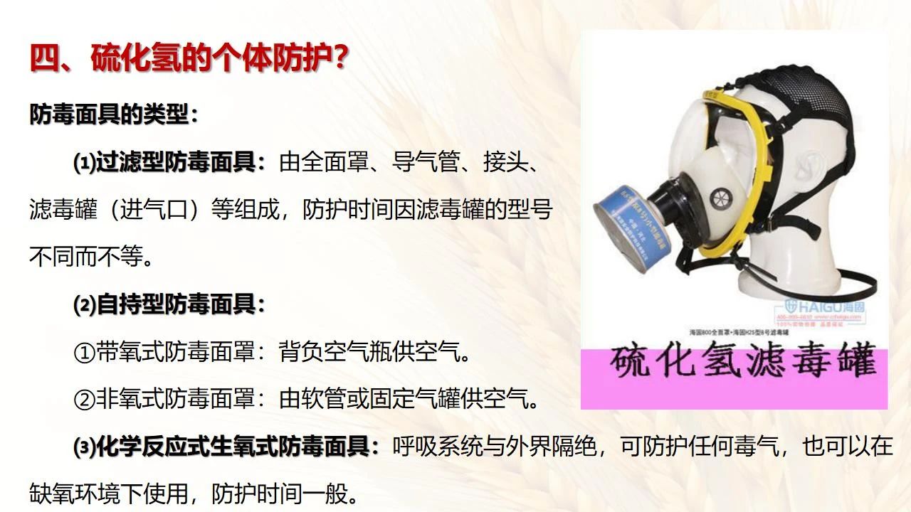 1預(yù)防措施 涉及硫化氫作業(yè)活動,必須嚴(yán)格遵守《化學(xué)品生產(chǎn)單位特殊作業(yè)安全規(guī)范》(GB 30871-2014)及相關(guān)的規(guī)范、標(biāo)準(zhǔn)、制度,并特別注意以下幾點: 1.產(chǎn)生硫化氫的生產(chǎn)設(shè)備應(yīng)盡量密閉,并設(shè)置自動報警裝置(不能根據(jù)臭味來判斷危險場所硫化氫的濃度,硫化氫達到一定濃度時會導(dǎo)致嗅覺麻痹)。 2.對含有硫化氫的廢水、廢氣、廢渣,要進行凈化處理,達到排放標(biāo)準(zhǔn)后方可排放。 3.進入可能存在硫化氫的密閉容器、坑、窯、地溝等工作場所,應(yīng)首先測定該場所硫化氫濃度,采取通風(fēng)排毒措施,確認安全后方可操作。作業(yè)過程中應(yīng)連續(xù)測定硫化氫濃度。 4.操作時做好個人防護措施,配好防毒用具(防毒面具一般為逃生自救用),作業(yè)工人腰間縛以救護帶或繩子。做好互保,要2人以上人員在場。 5.患有肝炎、腎病、氣管炎的人員不得從事接觸硫化氫作業(yè)。 6.加強員工有關(guān)專業(yè)安全知識技能的培訓(xùn),提高自我防護意識和能力。 2作業(yè)有關(guān)注意事項 (1)檢查采樣器是否完好,采用密閉取樣; (2)佩戴便攜式有毒有害(硫化氫)氣體檢測儀、適用的防毒用具,站在上風(fēng)向,并有專人監(jiān)護; (3)采樣過程中手閥應(yīng)慢慢打開,不要用扳手敲打閥門。 (1)佩戴便攜式有毒有害(硫化氫)氣體檢測儀、適用的防毒用具,站在上風(fēng)向,并有專人監(jiān)護; (2)切水閥與切水口應(yīng)有一定距離; (3)脫出的酸性氣要用氫氧化鈣或氫氧化鈉溶液中和,并有隔離措施,防止過路行人中毒; (4)切水過程中人不能離開現(xiàn)場。 需進入設(shè)備、容器進行檢修,應(yīng)經(jīng)過加盲板、吹掃、置換、采樣分析合格、辦理進設(shè)備容器安全作業(yè)票后,才能進入作業(yè)。但有些設(shè)備容器在檢修前,需進人排除殘余的油泥、余渣,清理過程中會散發(fā)出硫化氫和油氣等有毒有害氣體,必須做好安全措施。以下七項為設(shè)備內(nèi)檢修作業(yè)步驟: (1)制定施工方案; (2)作業(yè)人員經(jīng)過安全技術(shù)培訓(xùn); (3)進設(shè)備容器作業(yè)前,必須作好氣體采樣分析; (4)辦理進入受限空間安全作業(yè)票; (5)佩戴防毒用具(空呼等),攜帶好安全帶(繩); (6)作業(yè)時間不宜過長,一般不超過30min; (7)施工過程須有專人監(jiān)護,必要時應(yīng)有醫(yī)務(wù)人員在場。 (1)執(zhí)行進入受限空間作業(yè)安全防護規(guī)定; (2)控制各種物料的切水排凝進入下水道; (3)采用強制通風(fēng)或自然通風(fēng),保證氧含量為18%-21%,在富氧環(huán)境下不應(yīng)大于23.5%; (4)配帶防毒用具(空呼等); (5)攜帶好安全帶(繩); (6)進入下水道內(nèi)作業(yè)井下要設(shè)專人監(jiān)護,并與地面保持密切聯(lián)系。 (1)下油池清理前,必須用泵把污油、污水抽干凈,用高壓水沖洗置換; (2)采樣分析,根據(jù)測定結(jié)果確定施工方案和安全措施,辦理好進入受限空間作業(yè)票。 (3)配備防毒用具(空呼等),有專人監(jiān)護,必要時要攜好安全帶(繩); 設(shè)備、容器、管線存有硫化氫物料的堵漏、拆卸或安裝作業(yè)時,必須做到: (1)嚴(yán)格控制帶壓作業(yè),應(yīng)把與其設(shè)備容器相通的閥門關(guān)死,安裝盲板,撤掉余壓;辦理相應(yīng)安全作業(yè)票; (2)佩戴適用的防毒用具(空呼等),有專人監(jiān)護; (3)拆卸法蘭螺絲時,在松動之前,不要把螺絲全部拆開,嚴(yán)防有毒氣體大量沖出。 (1)平穩(wěn)操作,嚴(yán)防跑、冒、滴、漏; (2)裝置易泄漏或氣體易積聚的位置應(yīng)安裝固定式硫化氫檢測報警器; (3)加強機泵設(shè)備的維護管理,減少泄漏; (4)可能有泄漏的地方加強通風(fēng); (5)涉及硫化氫物料的容器、管線、閥門等要定期檢查更換; (6)發(fā)現(xiàn)硫化氫濃度高,要先報告,采取一定防護措施后,才能進入現(xiàn)場檢查和處理。 (1)嚴(yán)禁在進、出油及調(diào)合過程中進行人工檢尺、測溫及拆裝安全附件等作業(yè); (2)必要的檢查、切水,操作人員應(yīng)佩戴便攜式有毒有害(硫化氫)氣體檢測儀,站在上風(fēng)向,并有專人監(jiān)護; (3)準(zhǔn)備好適合的防毒面具,以便急用。 涉及有可能存在產(chǎn)生(逸出、外泄)硫化氫或者殘存硫化氫的清洗作業(yè)時,應(yīng)事先進行風(fēng)險辨識分析,并結(jié)合分析結(jié)果采取安全措施。