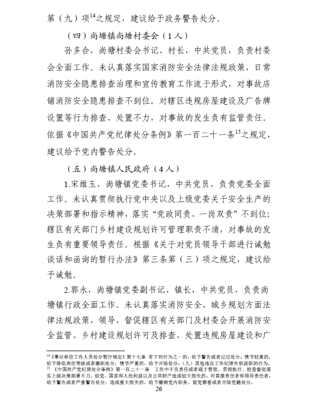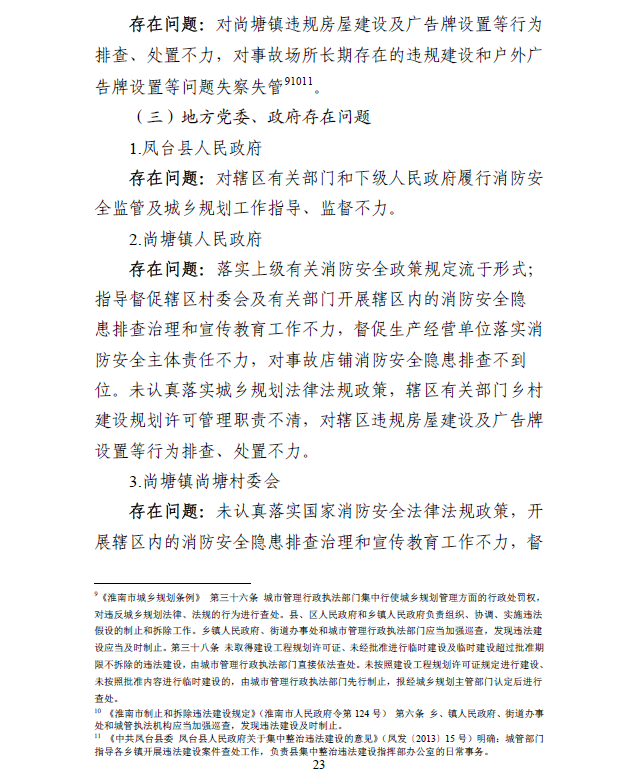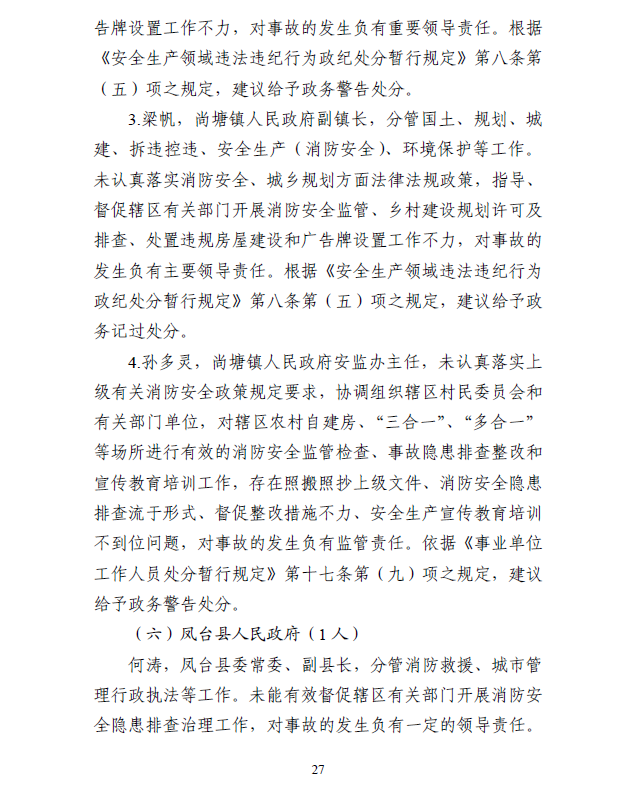 事故的間接原因為:事故建筑房主違規(guī)將原建筑進行擴建改造,改造時將原有室外疏散樓梯改為室內敞開式樓梯間,且未采用封閉樓梯間;建筑外窗設置戶外廣告牌,影響逃生和救援;店內消防安全措施不符合消防安全技術要求,事故場所人員違反有關規(guī)定在店內居?。坏胤秸捌溆嘘P部門消防安全監(jiān)管不到位;鳳臺縣公安局尚塘鎮(zhèn)派出所履行日常消防安全監(jiān)督檢查職責不力;尚塘鎮(zhèn)人民政府指導督促轄區(qū)村委會及有關部門開展轄區(qū)內的消防安全隱患排查治理和宣傳教育工作不力。