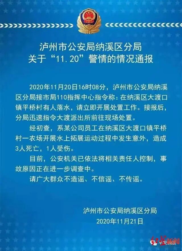 經(jīng)警方初查,系某公司員工在納溪區(qū)大渡口鎮(zhèn)平橋村一農(nóng)場開展水上拓展運動過程中發(fā)生意外,造成3人死亡,1人受傷。目前,公安機關(guān)已依法將相關(guān)責(zé)任人控制,事故原因正在進一步調(diào)查中。警方提請廣大群眾不造謠、不信謠、不傳謠。