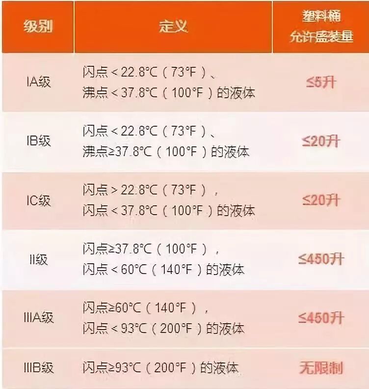 普通塑料桶,可以盛一定的可燃、易燃液體,但體積受到限制,一般僅限于生活用量,各級別可燃、易燃液體允許盛裝體積如下: