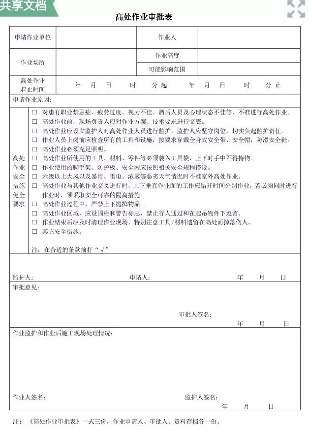 進(jìn)行登高作業(yè)時必須有專人監(jiān)護(hù)且取得高處作業(yè)審批表和高處作業(yè)票方可作業(yè),嚴(yán)禁無票作業(yè)。審批包括以下內(nèi)容: 1、應(yīng)赴現(xiàn)場檢查確認(rèn)安全防護(hù)措施(安全帶、安全帽、防護(hù)欄等); 2、應(yīng)查看是否配備監(jiān)護(hù)人員、現(xiàn)場管理人員,查驗(yàn)作業(yè)人員是否經(jīng)過培訓(xùn)并考核合格取得相應(yīng)證書; 3、應(yīng)檢查現(xiàn)場是否按照規(guī)定穿戴勞保用品,作業(yè)前要檢查,作業(yè)中應(yīng)正確使用防墜落用品與登高器具、設(shè)備。 4、應(yīng)確認(rèn)具備施工條件,方可在高處作業(yè)審批表簽字,發(fā)放高處作業(yè)票,誰簽字誰負(fù)責(zé)。(可上網(wǎng)搜索“高處作業(yè)審批”、“高處作業(yè)票”獲得范本)
