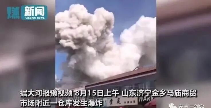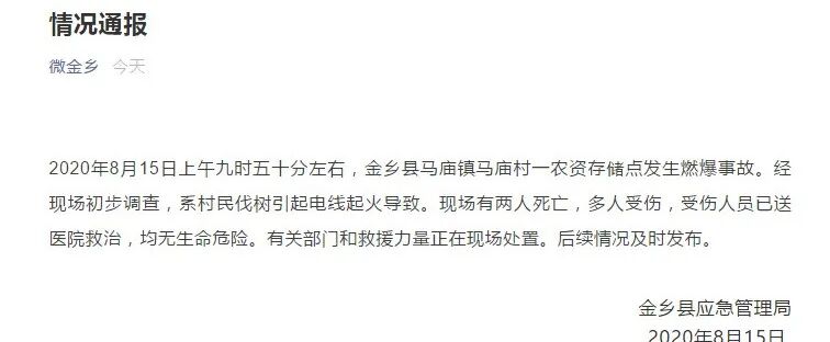 2020年8月15日上午,山東濟寧金鄉(xiāng)馬廟商貿(mào)市場附近一倉庫發(fā)生爆炸。現(xiàn)場視頻顯示,巨型白色蘑菇云騰空而起,之后又傳來爆炸聲。濃煙滾滾,某些門面玻璃被震碎,車輛被震壞,房屋墻體垮塌,救援車輛已到達現(xiàn)場。現(xiàn)場有兩人死亡,多人受傷,受傷人員已送醫(yī)院救治,均無生命危險。據(jù)報道,8月15日上午九時五十分左右,金鄉(xiāng)縣馬廟鎮(zhèn)馬廟村一農(nóng)資存儲點發(fā)生燃爆事故。經(jīng)現(xiàn)場初步調(diào)查,系村民伐樹引起電線起火導致。有關部門和救援力量正在現(xiàn)場處置。