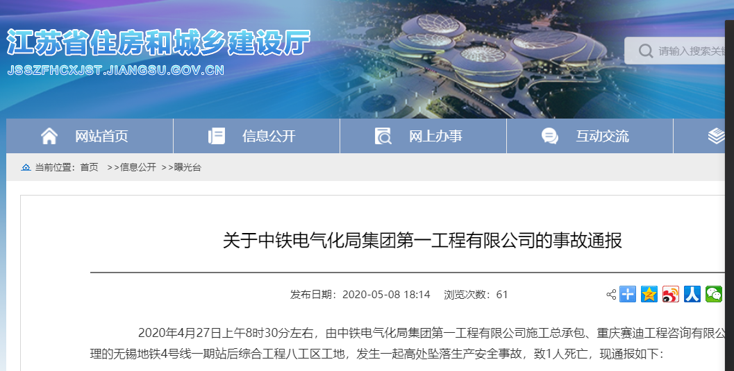 2020年4月27日上午8時30分左右,由中鐵某局集團第一工程有限公司施工總承包、重慶賽迪工程咨詢有限公司監(jiān)理的無錫地鐵4號線一期站后綜合工程八工區(qū)工地,發(fā)生一起高處墜落生產(chǎn)安全事故,致1人死亡,現(xiàn)通報如下: