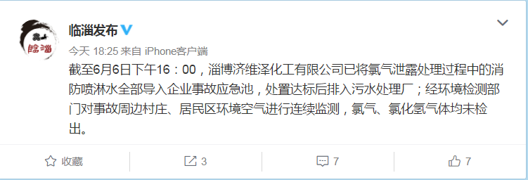 截至6月6日下午16:00,淄博濟維澤化工有限公司已將氯氣泄露處理過程中的消防噴淋水全部導(dǎo)入企業(yè)事故應(yīng)急池,處置達標(biāo)后排入污水處理廠;經(jīng)環(huán)境檢測部門對事故周邊村莊、居民區(qū)環(huán)境空氣進行連續(xù)監(jiān)測,氯氣、氯化氫氣體均未檢出。