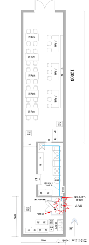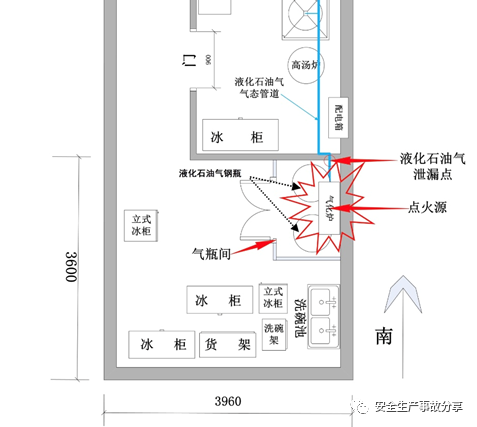 液化石油氣為重質(zhì)氣體,泄漏后,與空氣充分混合形成爆炸性氣體混合物。受限于餐館的建筑結(jié)構(gòu)和空間布局,液化石油氣擴散空間通風(fēng)不良,氣體滯留在鋼瓶間和過道,隨著時間推移混合云團(tuán)濃度處于爆炸極限范圍(1.5%~9.5%)的敏感區(qū)域,此時由于氣化爐定時加熱啟動,而氣化爐配電盒不符合防爆要求,引起電氣打火,于3點10分左右引發(fā)爆炸。