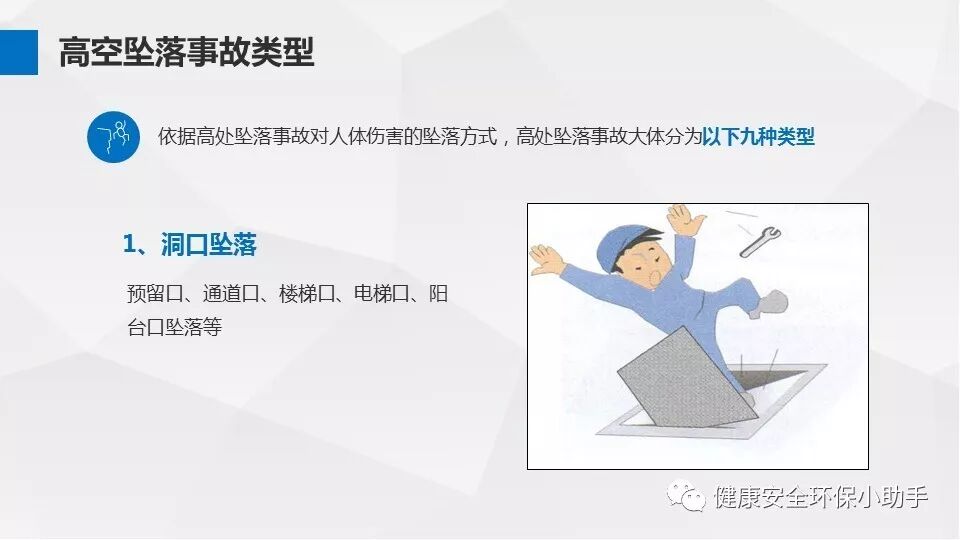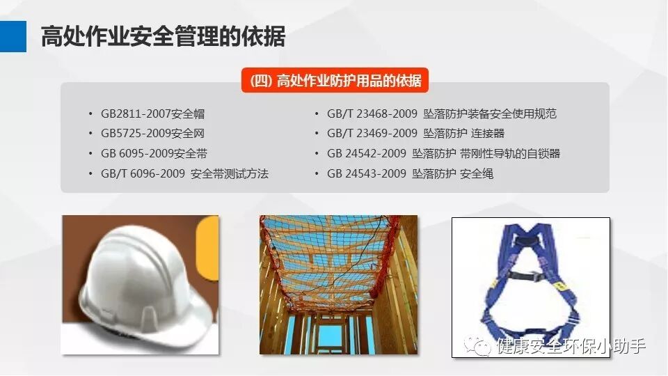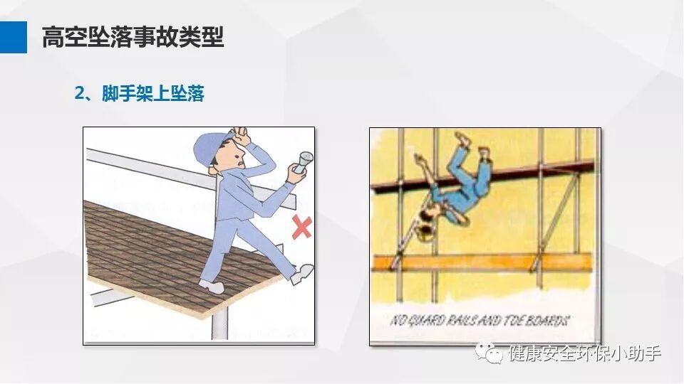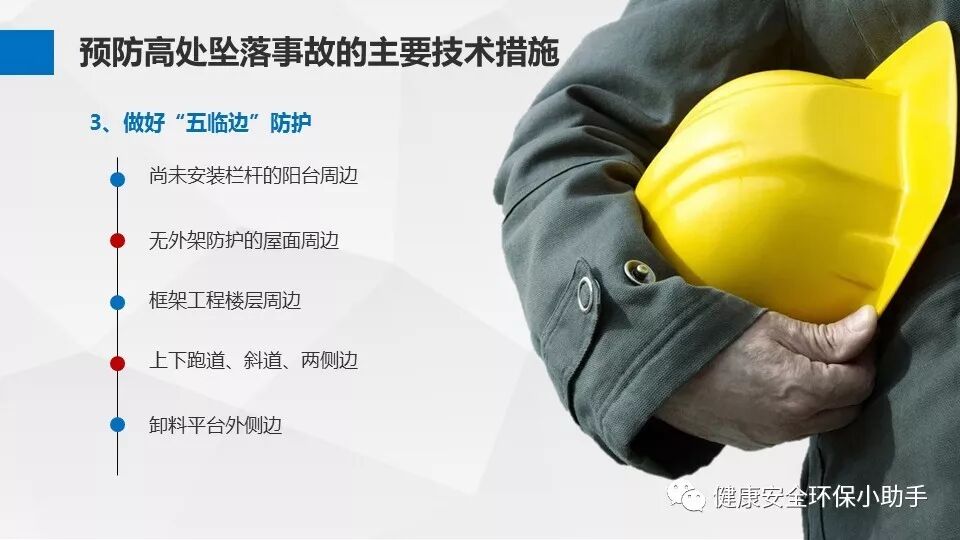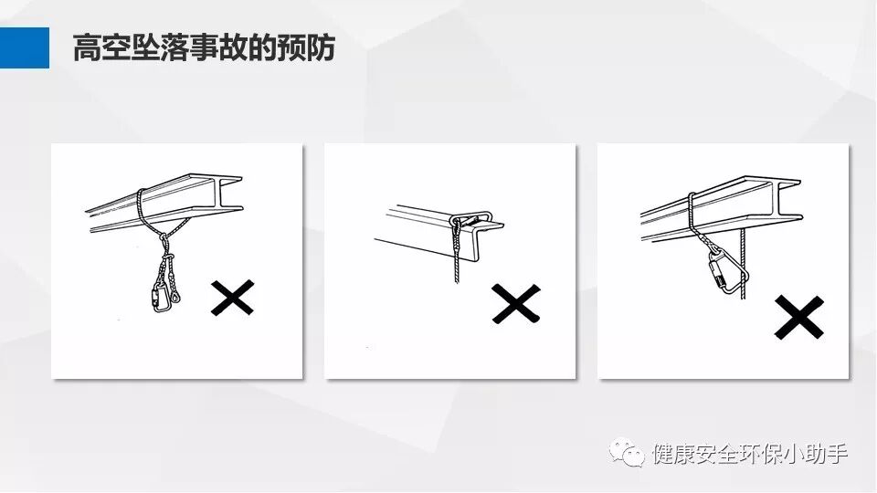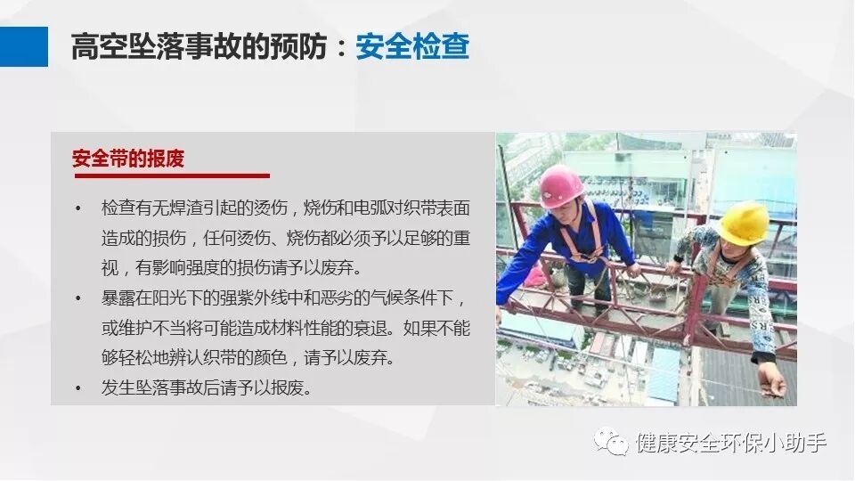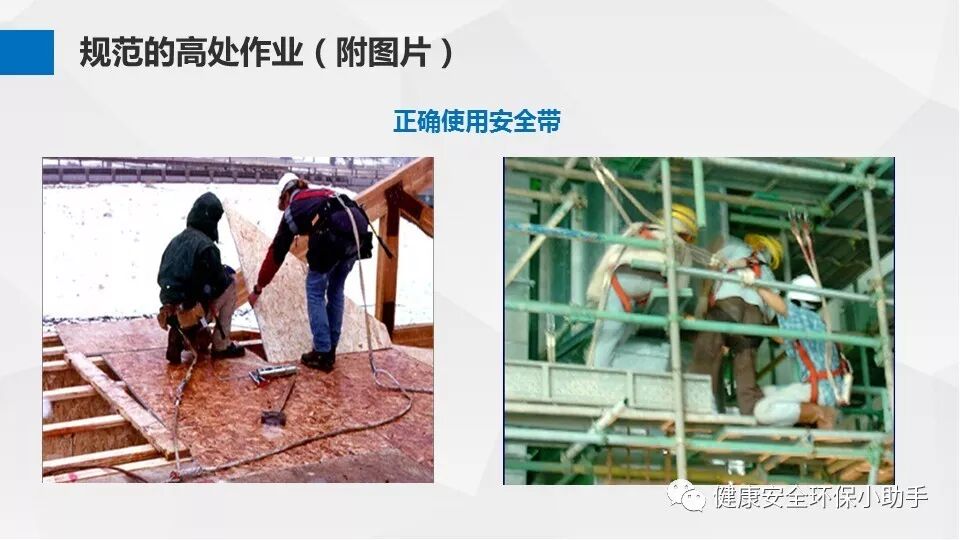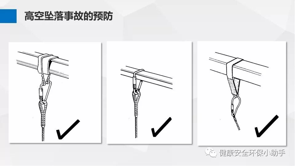 預(yù)防墜落 / 去除墜落物 / 區(qū)域管制 1 高空作業(yè)區(qū)間安全措施事項 1) 下部管制/設(shè)定作業(yè)區(qū)域 2) 工人使用2個安全掛鉤 3) 下部安排信號手/管制人員 4) 上部生命線 5) 作業(yè)踏板(可能設(shè)置的時候-腳手架) 因管道及設(shè)備設(shè)置比較困難的情況時 討論第2套方案 6) 設(shè)置升降通道健康安全環(huán)保小助手 7) 工人移動區(qū)域安全守則(生命線/踏板) 8) 照明設(shè)備(必要時) 9) 4m 以上時設(shè)置防墜器 □ 搭設(shè)(安全)標(biāo)準(zhǔn) 1) 充分做好腳手架防顛倒措施。 2) 上部作業(yè)踏板要滿鋪。 3) 腳手架高度 : 下方寬度的4倍以內(nèi) 4) 防顛倒 : 安裝防顛倒護(hù)翼(outrigger)。 5) 輪子上要有制動裝置。健康安全環(huán)保小助手 6) 移動時除外,必須開啟制動裝置。 7) 頂部要設(shè)置安全護(hù)欄和踢腳線。 8) 上下通道要堅固。 9) 標(biāo)示核載重量(250Kg以下)。 10) 移動腳手架時上方不能有人。 11) 附近有高壓電線時做好絕緣措施。【一】防墜落勞保用品使用標(biāo)準(zhǔn)