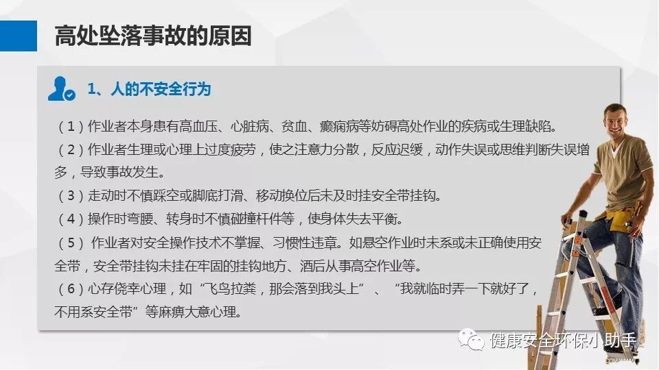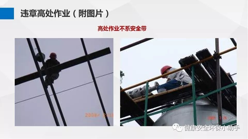 3 沒有戴安全帽、系安全帶,不扎緊褲管和無人監(jiān)護(hù)不登高。