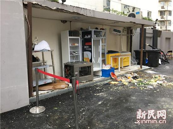 今天上午,新民晚報記者在事發(fā)現(xiàn)場看到,新閘路1039弄弄口人行道上,一臺挖掘機已對受損管道區(qū)域進行開挖,現(xiàn)場有燃氣搶修車及搶修人員。而一旁弄堂門口的一間儲物倉庫內的冰箱、空調等物品在事故中損壞,冰箱內的食物散落一地。此外,弄堂旁的一幢大樓外的PVC材質的落水管斷裂,一片狼藉。據(jù)稱,現(xiàn)場一度曾有明火。
